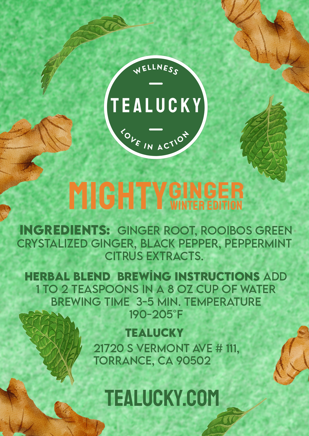 Warm up the season with this invigorating, winter-crafted blend. Mighty Ginger – Winter Edition brings together the smooth, naturally sweet character of green rooibos with the bold warmth of ginger and the cool lift of peppermint. Crystallized ginger adds a comforting sweetness, while a pinch of black pepper delivers a subtle, spicy spark that lingers beautifully. Bright citrus extracts round out the cup, adding a refreshing, aromatic twist that balances the blend perfectly.